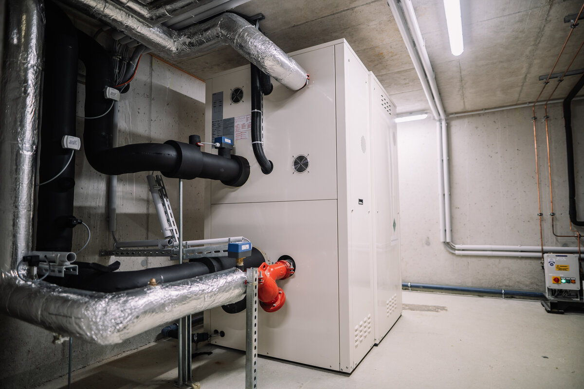Nach dem Brand wurde die gesamte Haustechnik von Grund auf neu geplant. Im Fokus standen klare Ziele: weniger Energie verbrauchen, mehr Komfort bieten, zukunftsfähig bauen. Entstanden ist ein System, das wirtschaftlich arbeitet, umweltfreundlich ist und sich flexibel an neue Anforderungen anpassen lässt. In das neue Konzept eingebunden wurde auch die bestehende Hackschnitzelheizung, die vom Brand verschont blieb. Sie bildet weiterhin das Rückgrat der Wärmeversorgung. Ebenso konnten bestehende Schaltschränke saniert und in die neue Haustechnik integriert werden. Das spart Ressourcen und beschleunigte den Wiederaufbau.