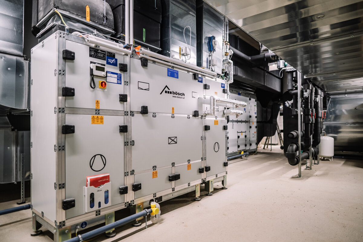 Neu hinzu kamen vier Lüftungsgeräte von bösch sowie eine zusätzliche Kältemaschine mit 118 kW Kühlleistung für Klimatisierung und Lüftung. Ein weiterer Effizienzbaustein: Die Abwärme der Kältemaschine wird in das Heizsystem eingespeist und so energetisch sinnvoll genutzt. Ergänzt wird das System durch moderne Brandschutzlösungen von AGNOSYS und eine leistungsfähige Gebäudeautomation von bösch.
